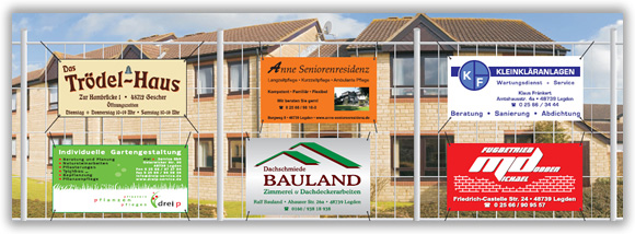 Werbebanner aus PVC-Planenmaterial sind wetter- und reissfest, langlebig, flexibel einsetzbar, einfach in der Handhabung, platzsparend und leicht zu transportieren.